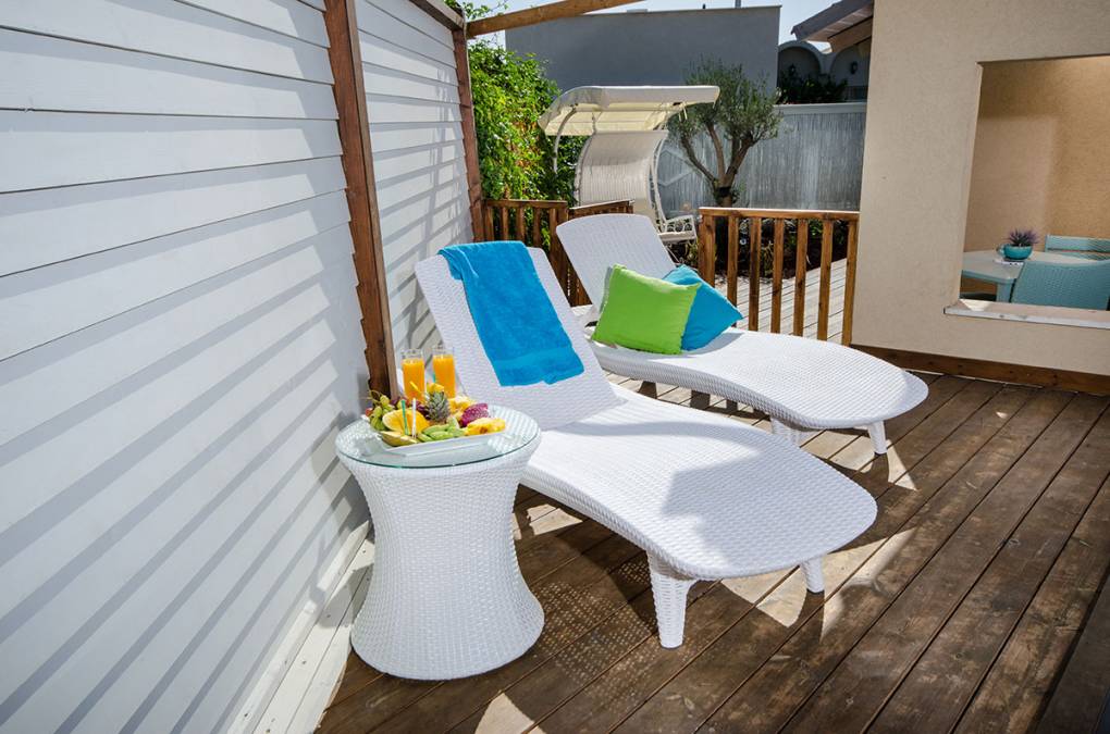 היחידה כוללת: מרפסת פרטית, מיטה זוגית, סאונה, מטבחון מאובזר במקרר, פינת קפה, כיריים, מיקרוגל וכלי מטבח, חדר רחצה נעים עם מגבות ותחליבים וטלוויזיה עם חיבור לכבלים.